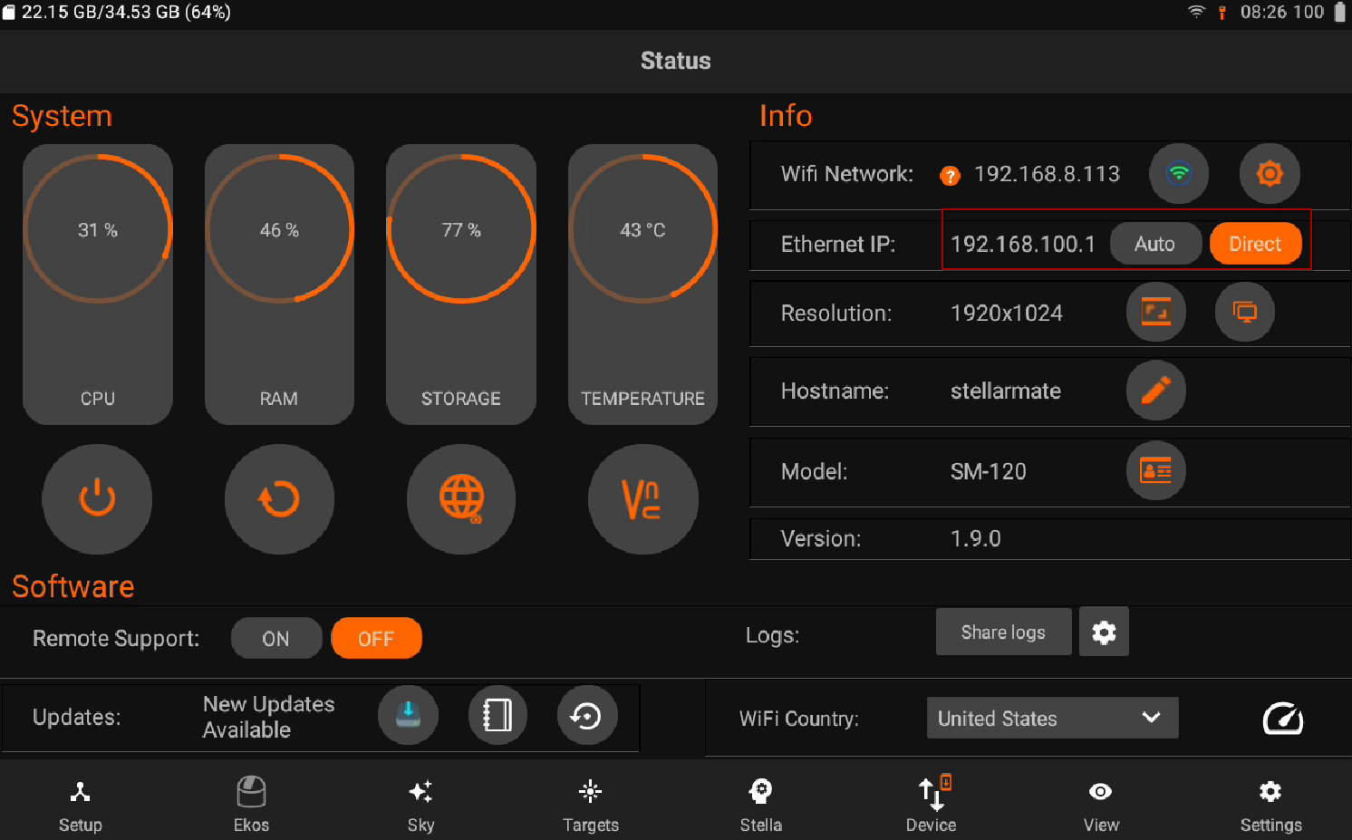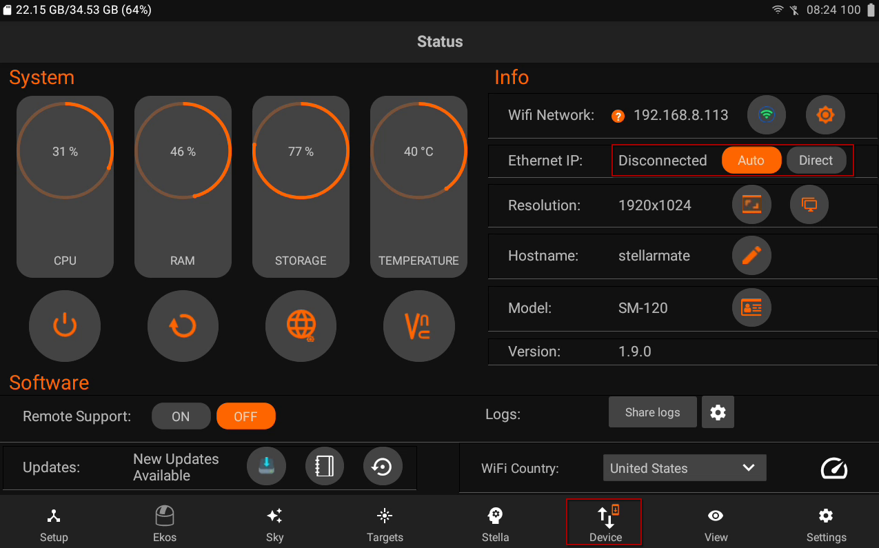 From StellarMate App → Device tab, toggle the Direct Ethernet button. After Direct Ethernet is enabled, you need to configure your PC/Mac to communicate using the following settings:
